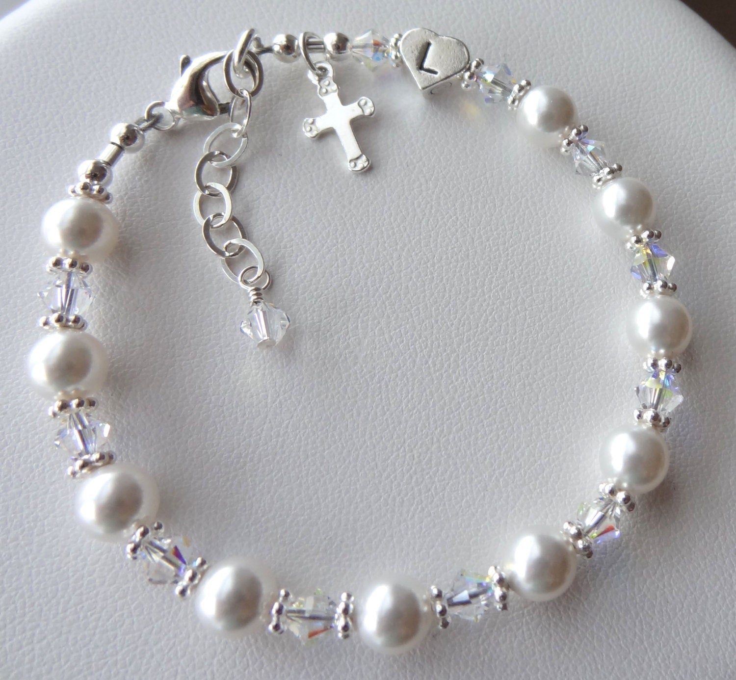 Sterling Crystal Pearl Heart Initial Personalized Girl Rosary Bracelet-First Communion Girls Pearl Rosary Bracelet