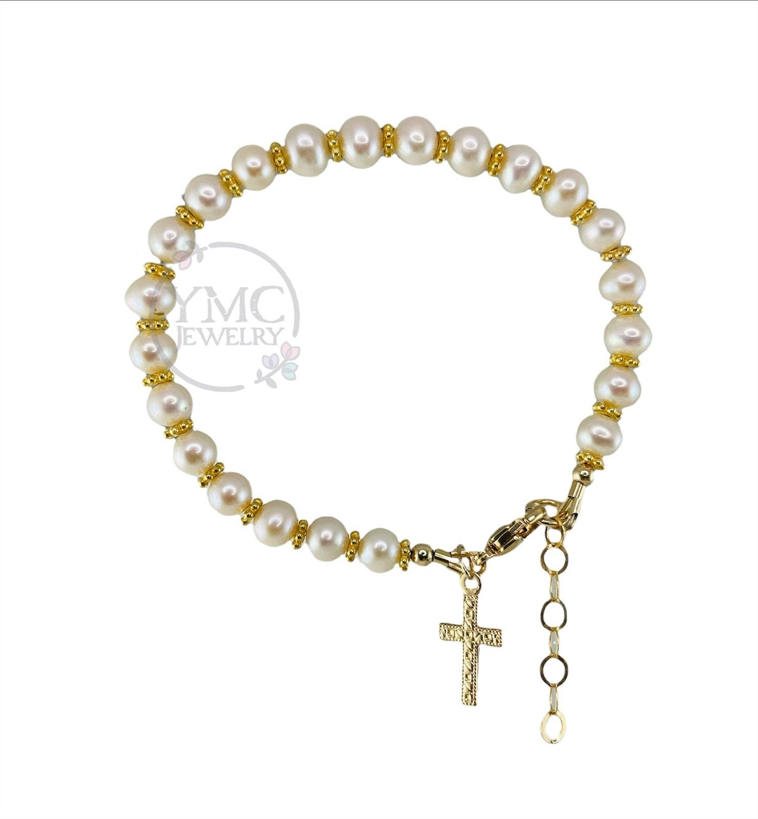 Gold Real Pearl Cross Baptism Bracelet,Flower Girl Bracelet,Pearl Baptism to Bride Bracelet,First Communion-Confirmation,Baby Pearl Bracelet